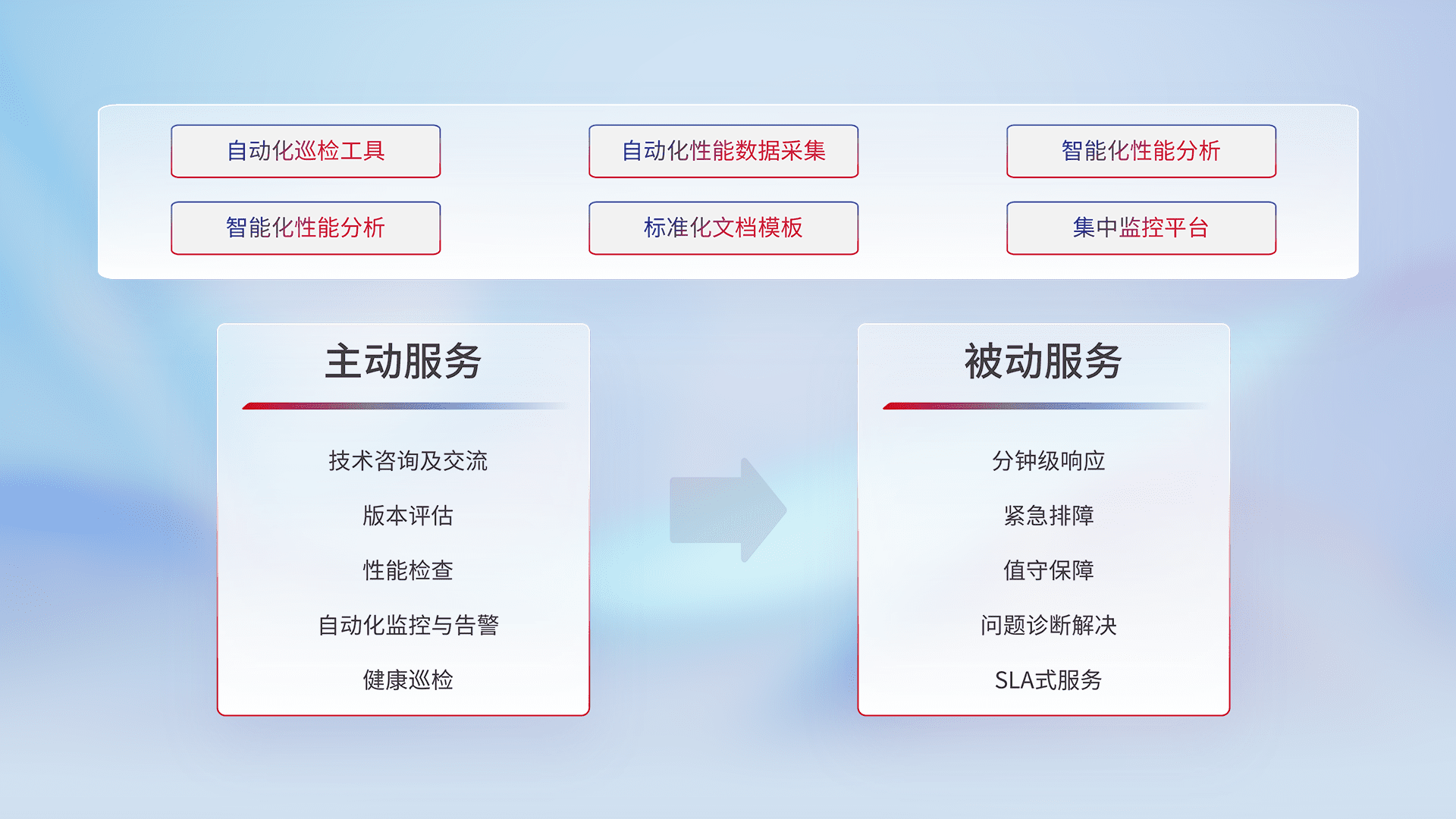 智能化工具和标准化文档,,保障服务质量,,提供主动服务(包含技术咨询、、版本评估、、、、性能检查、、、、自动化监控与告警、、、健康巡检)和被动服务包含(分钟级响应、、、紧急排障、、、值守保障、、、、问题诊断解决、、、SLA服务)。。。。